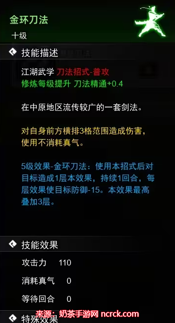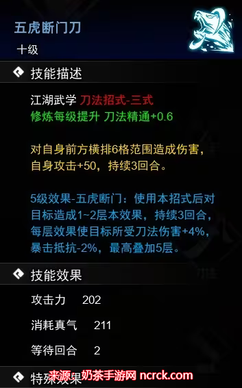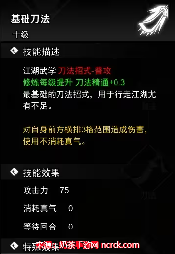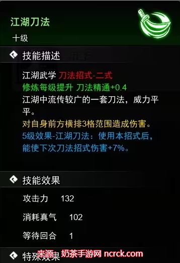 描述:对自身前方横排3格范围造成伤害5,并使用本招式后能使下次刀法招式伤害增加7%。