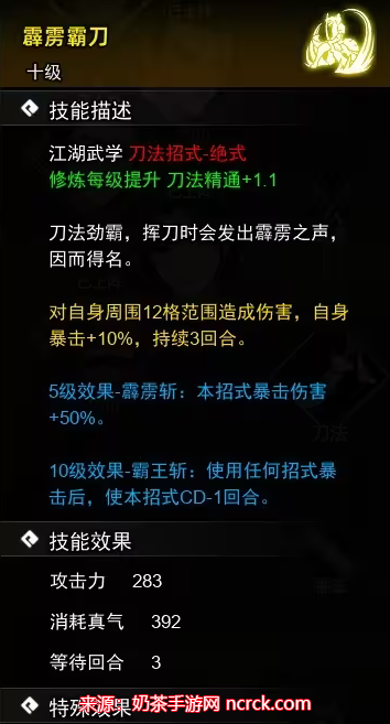 描述:对自身周围12格范围造成伤害,自身暴击率增加10%,持续3回合。