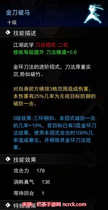 描述:对自身前方横排3格范围造成伤害,本伤害有25%几率为无视目标防御的破防一击。