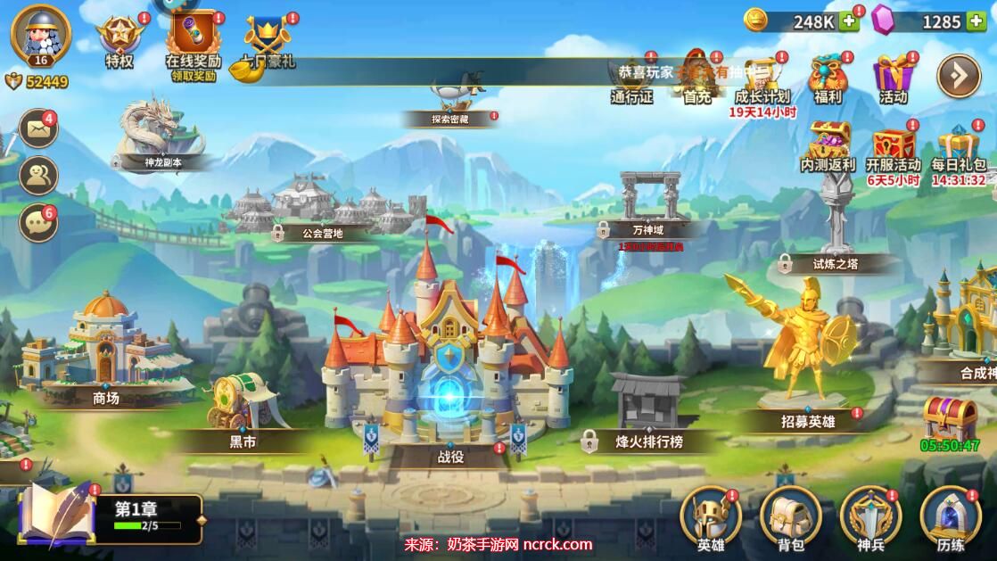 《古国崛起》是一款富有策略性的游戏,玩家可以在其中收集英雄、制定战略、挑战各种副本,体验热血沸腾的战斗,游戏中有丰富的社交互动,包括公会副本、探索密藏以及试炼之塔等玩法,可以与其他玩家一起合作或竞技。