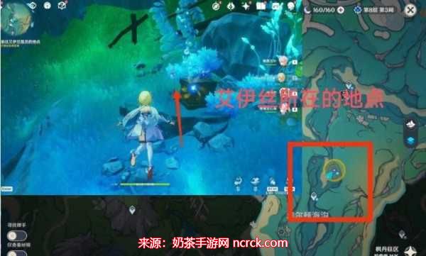 打开地图,找到埃尔顿海沟附近的传送锚点,然后朝东北方向前进,你将能够看到艾伊丝的身影。