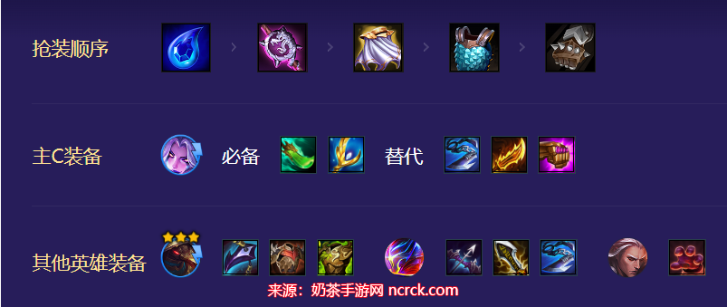 在装备方面,优先给莫甘娜装备青龙刀以及拉莫斯的反甲龙牙。随后,给拉莫斯和莫甘娜补充适合他们的装备,佛耶戈可以带偷偷,而烬则负责捡多余的物理装备。