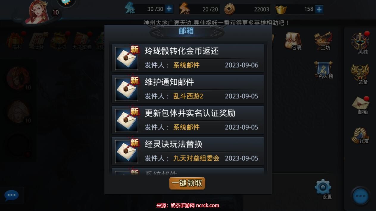 5、一旦兑换成功,进入游戏的邮箱界面。在那里,你将看到一封包含奖励的邮件。点击“一键领取”即可。