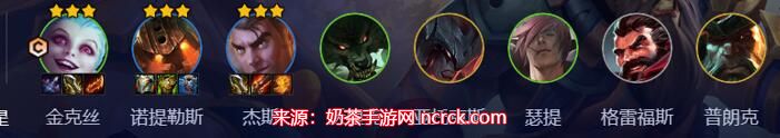 金克斯(核心输出)、诺提勒斯(前排坦克)、杰斯(次要输出)、沃里克(前排控制)、亚托克斯(前排输出)、瑟提(前排坦克)、格雷福斯(中排输出)、普朗克(控制/辅助)