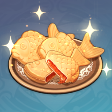 介绍:鲷鱼形状的点心。脆脆的外皮包裹着甜滋滋的内馅,深受稻妻人民喜爱。据说一开始只是普通的圆柱形,后来经过不断改良才逐渐变成了现在这般可爱的鱼形。