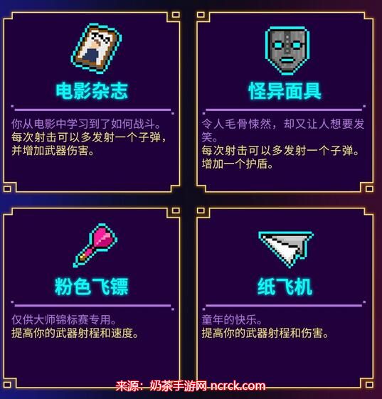 14、怪异面具:每次射击可以多发射一个子弹。增加一个护盾。