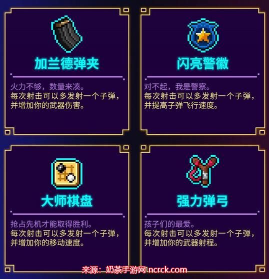 12、强力弹弓:每次射击可以多发射一个子弹,并增加你的武器射程。