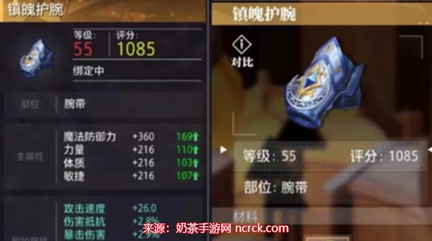 解析:镇魂护腕是剑侍不可或缺的装备之一。它提供了全面的属性增益,包括高达360的法术防御,这一点对剑侍的生存能力有明显的提升。此外,该装备还具有216点的力量、体质和敏捷,让你在攻防两方面都得到了全面的加强。
