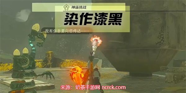 1、首先我们需要找到位于神庙内的管家魔像并与之对话。管家魔像会告诉我们需要完成神庙挑战染作漆黑。