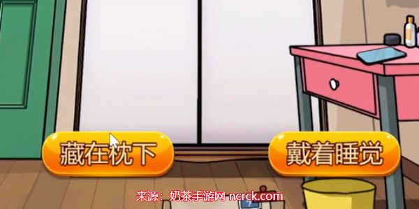 2、接着来到场景二,右划关上房门,左划关衣柜,右划关上抽屉,接着点击妆台上的手机自拍,然后选择藏在枕下;