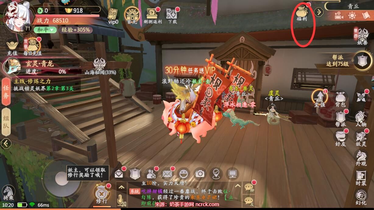 1、进入到山海与妖灵界面后,点击右上角的福利图标