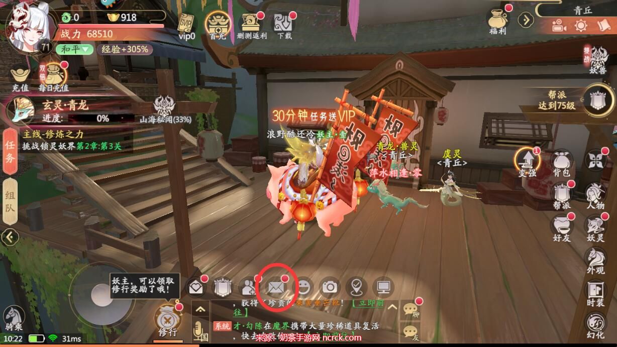 3、兑换后奖励会以邮件形式发送,我们回到游戏界面找到下方的邮箱图标,点击一下