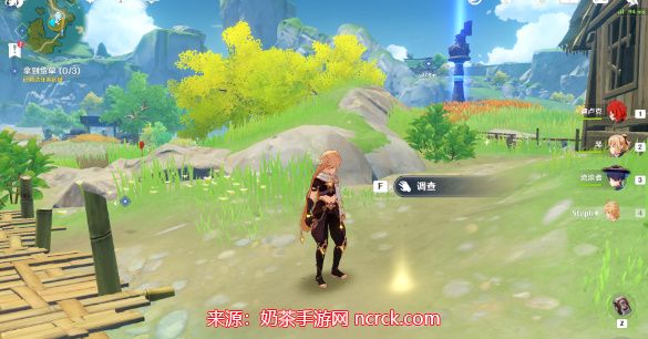 5、传送至荻花洲七天神像处锚点,往前方小屋走去,在屋子旁找到一个发光的调查点,点击调查拿到货单;