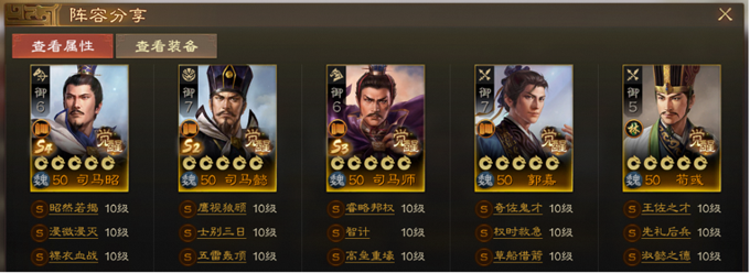 此阵容能获得三马同槽羁绊加成-司马懿、师、昭获得4%智力加成;原本司马懿魏智阵容缺少爆发单点伤害去打收割,司马昭的出现不仅可以智力差打出瞬间爆发,【兵无常势】+【浸微浸灭】让对面苦不堪言,同时司马师的吸取智力和统率不仅可以降低对方属性变相的增加己方输出;三马在于禁的辅助下,整体阵容更肉,容错率更高。