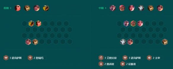 传统站位是将诺手站在最一侧,霞跟诺手站在一起能够很好的打输出帮助诺手无限刷新技能。塞恩站在最左则即可
