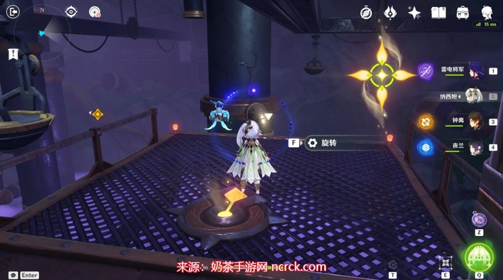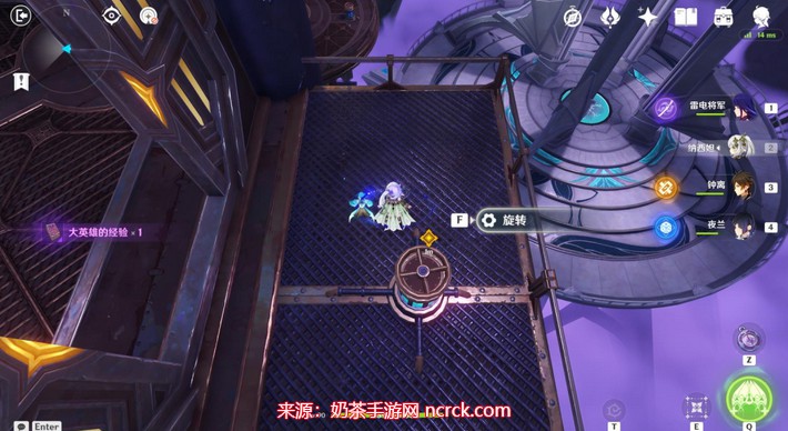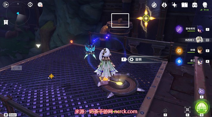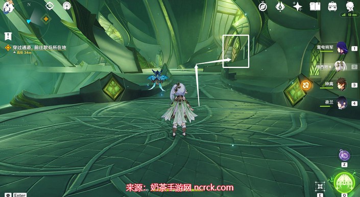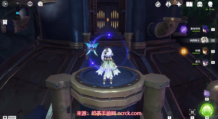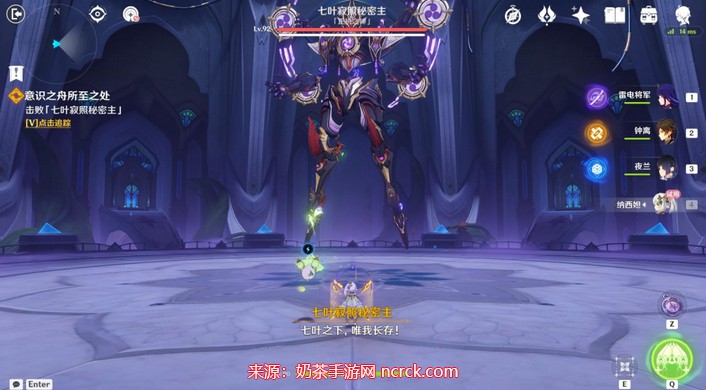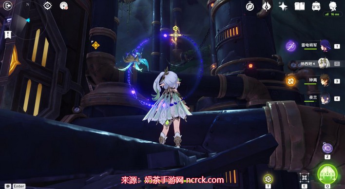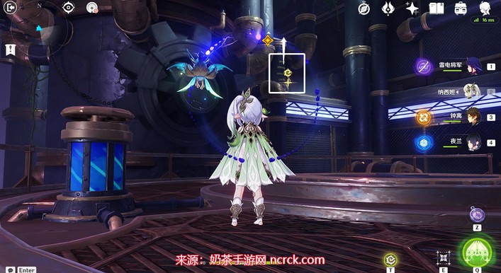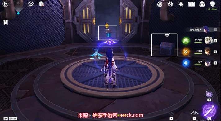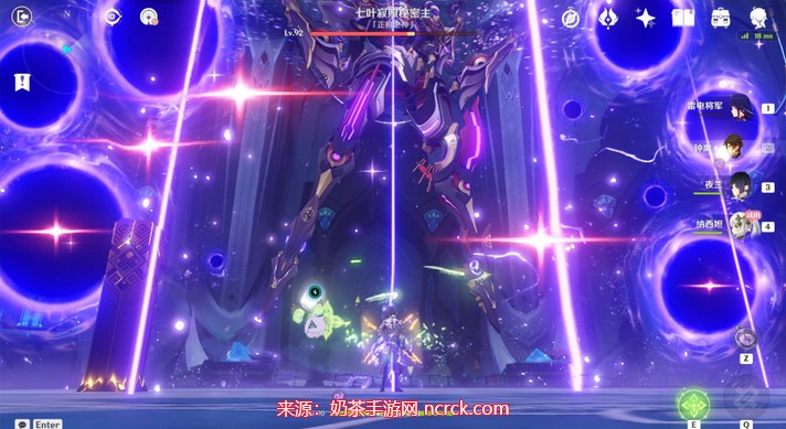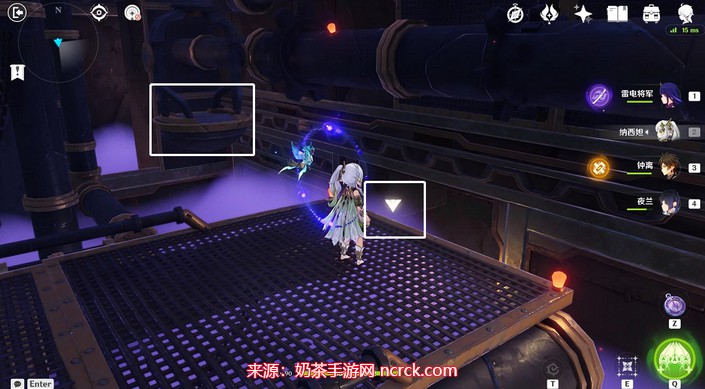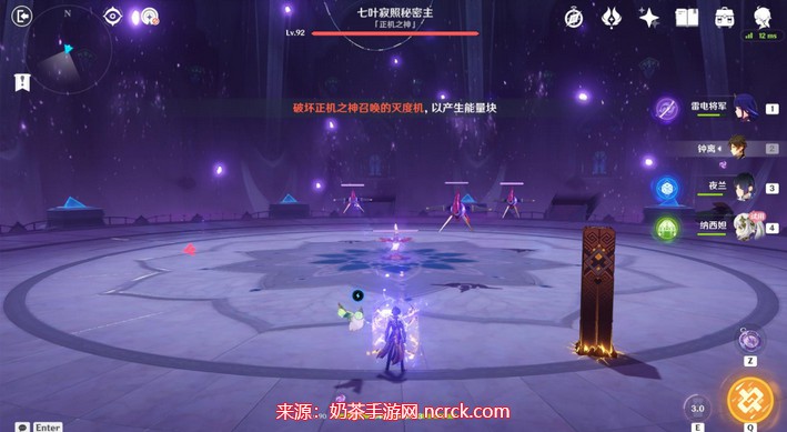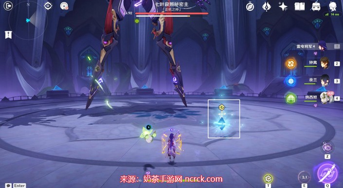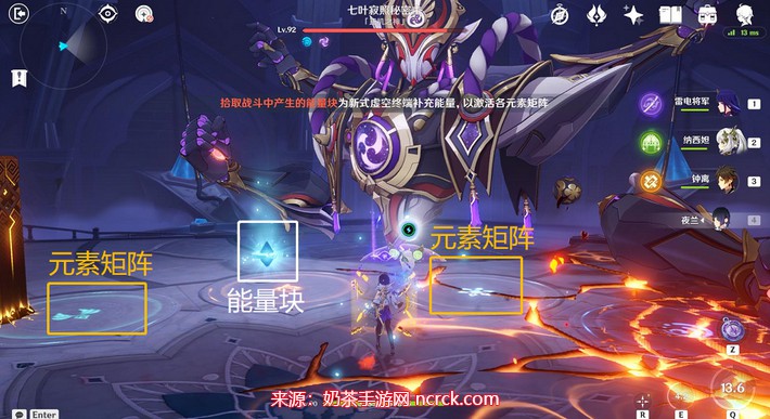 35、站小精灵周围可回血。要一直拾取图中能量块,2个能量块可激活1个元素矩阵。激活左右两边雷元素矩阵,使其瘫痪,获得成就「落落磊磊」。击败「七叶寂照秘密主」阶段①,观看动画。