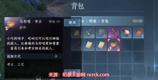 4.在武安村,打开角色栏并选择进行考古。在考古界面中,找到“断案直呼”选项,再点击“育宠”。这将使你获得一件名为鸟型哨的物品。