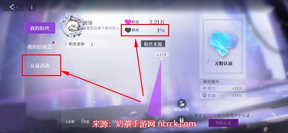 2.粉丝页面中,您将看到三个选项。选择最下方的【公益活动】,您还可以在此页面查看黑粉的占比。