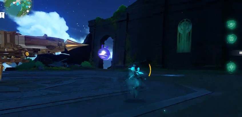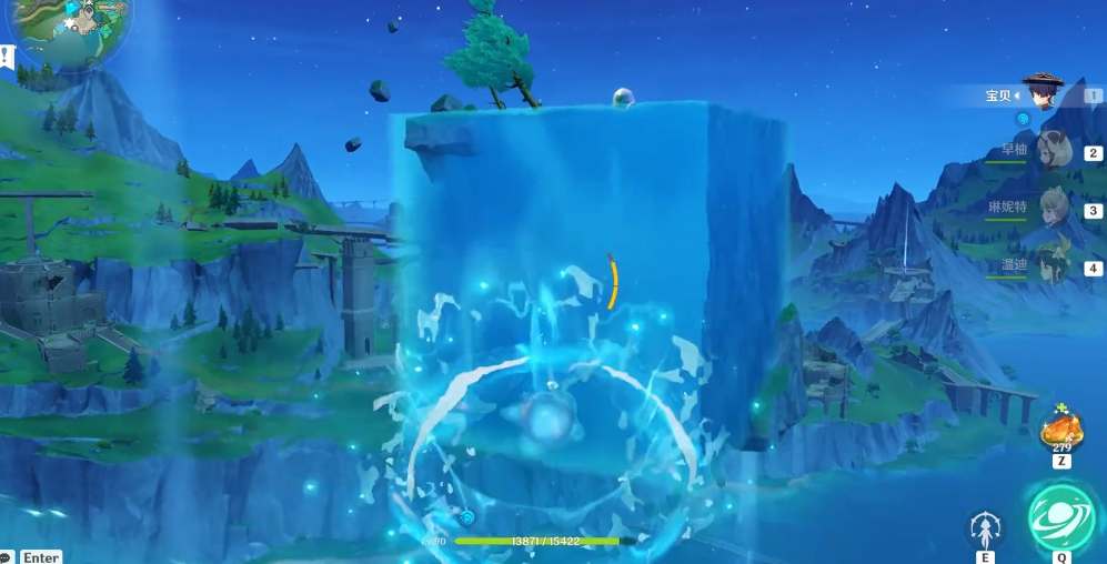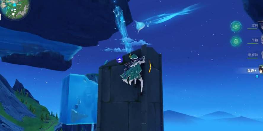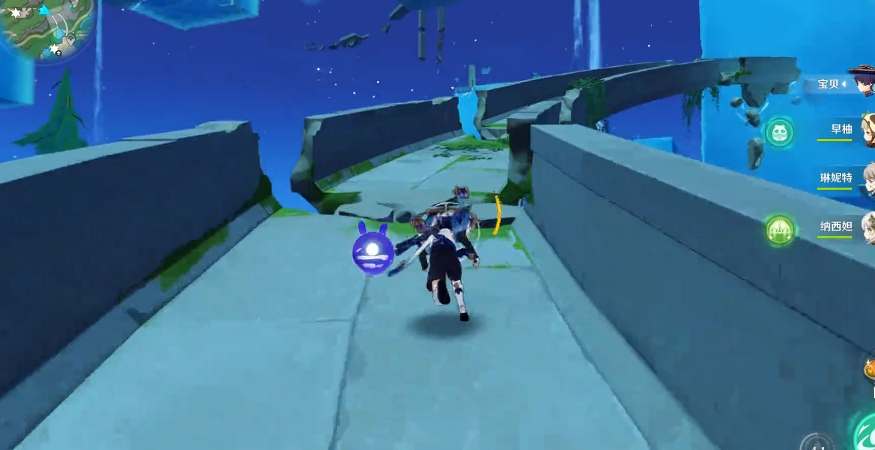 当你从水面出来时,使用角色技能或武器攻击泡泡,打破它,这将会开启一个传送门,让你传送到下一个水体上。通过传送门和气泡,继续向上游前进。