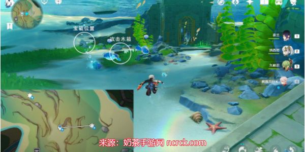 往地图的东方向游,找到膨膨兽旁边的木箱。