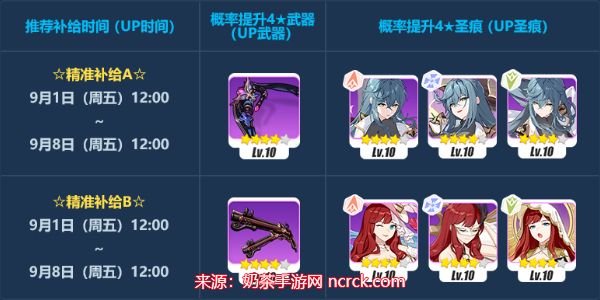 活动期间内,所有装备都有一定概率获取。然而,在指定装备UP时间内,这些装备的获取概率将显著提升!这次的4星武器包括双枪「往世的华章」、重炮「蓝焰银隼0019」、太刀「影鵺」、十字架「往世的蛇影」、镰刀「血渊之眸」、环刃「旅梦时舵」以及「往世的苦囚」。