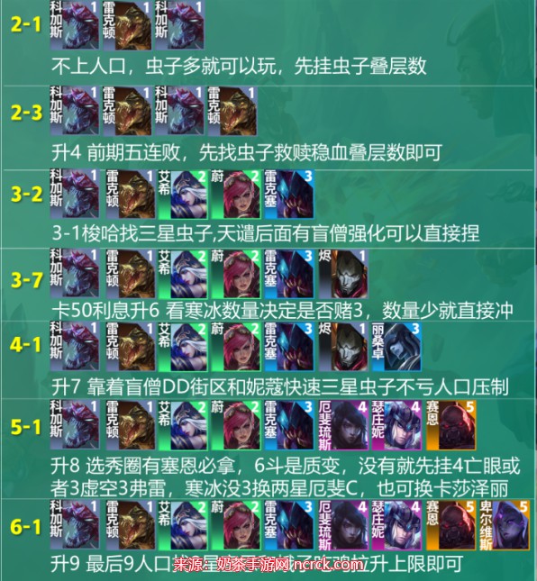 后期:在4-1阶段升级到7人阵容,依靠盲僧和妮的输出以及三星大虫子的爆发来压制对手。在5-1阶段升级到8人阵容,优先选择塞恩。若无塞恩,则可以考虑4亡眼或者3虚空3弗雷的羁绊。在6-1阶段升级到9人阵容,寻找2星塞恩和卑尔维斯,提升阵容的整体实力。