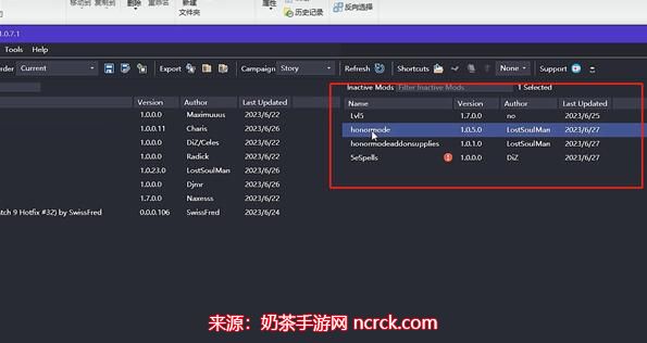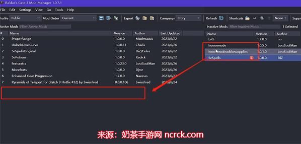 将刚刚添加的MOD文件从右侧的列表中拖曳至左侧,表示你想要安装这个MOD。
