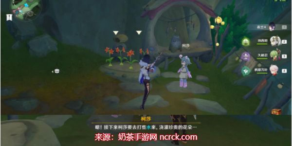 作为水元素角色,你需要前往柯莎的苗圃,帮助她浇水。完成后,与柯莎对话,获得一个奇特的零件。