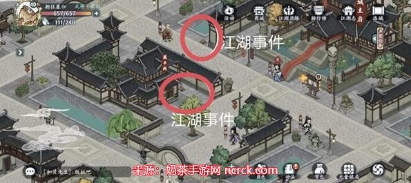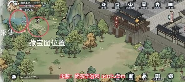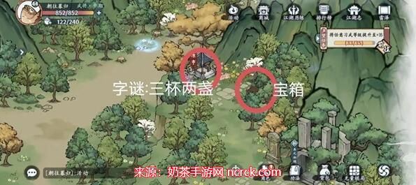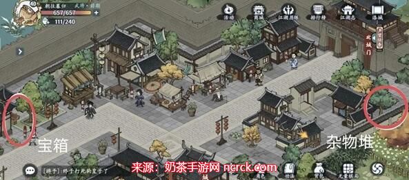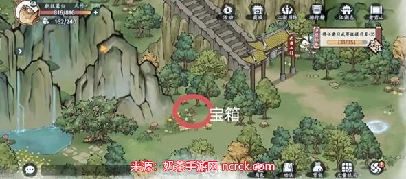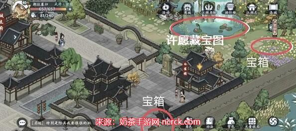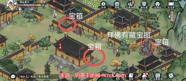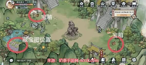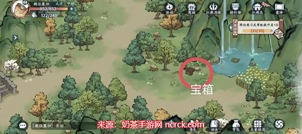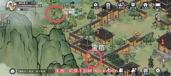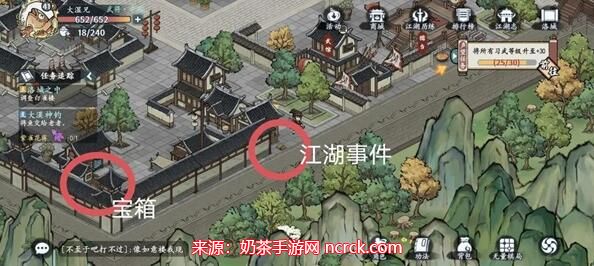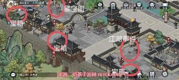 4、宝箱分别在左上中间和右下,奶茶图在左上,江湖事件在右边。