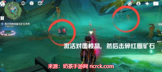 点击地图寻找最左边的矿石,但是附近的棱晶未激活。将最左边的棱晶移至最右边,将中间的棱晶移至最右边,初始位置的棱晶移至最左边,如图所示。
