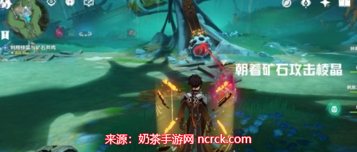 使用攻击棱晶的方式激活机关,发生冲击波,记得对着矿石攻击棱晶。