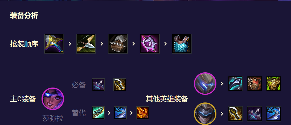 大ez是我们阵容的次要输出点,具备一定的战场收割能力。给大ez装备无尽、轻语、巨杀等输出装备。装备思路和莎弥拉一样,但在一般局势下,很难凑齐大ez所需的装备,所以能有什么装备就用什么装备,不强求。