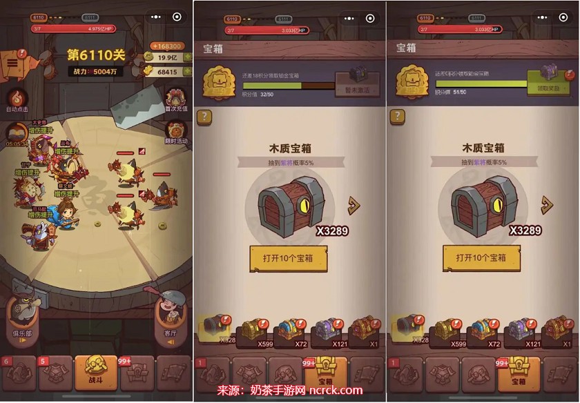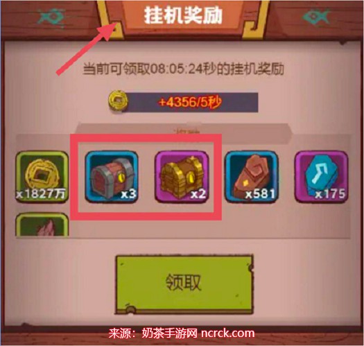 挂机游戏,挂满8小时05分钟可以领取3个木质宝箱和2个青铜宝箱的奖励。