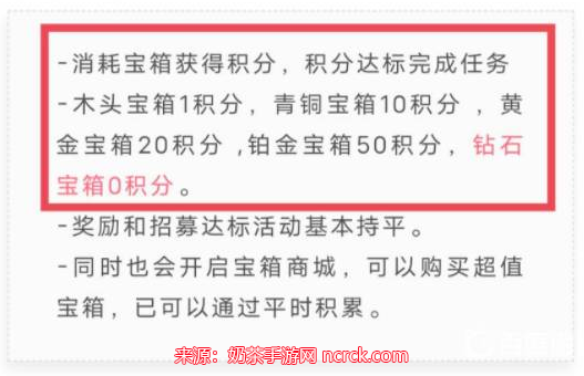 不同宝箱对应的积分:木头宝箱1积分,青铜宝箱10积分,黄金宝箱20积分,铂金宝箱50积分,钻石宝箱没有积分。