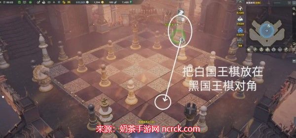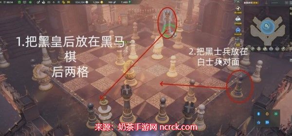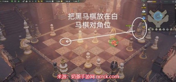 在这个房间里,先将黑皇后棋放在黑马棋的后两格位置,接着将黑士兵棋放在白士兵棋的对面,这样就成功地完成了本房间的解谜。