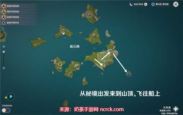 任务接取地点为「死兆星号」,您可以直接传送到该地点。然而,我推荐您选择稍微麻烦一些的路线,以增加冒险的乐趣。您可以从孤云阁秘境处上山,到达山顶后,再飞向「死兆星号」。