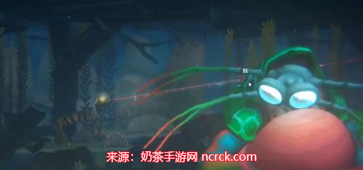 当螳螂虾跳起并刮起海浪、用力捶地,并蓄力准备攻击时(如下图所示),我们需要迅速拉起下图的开关。这将触发机关,吸引螳螂虾优先攻击机关而非我们。