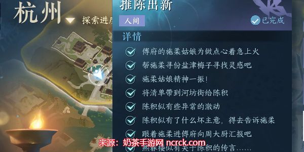 我们首先需要前往杭州(1413,1143)的位置与施柔进行对话。在对话中,施柔会提到他想要吃甜蜜饯,并告知我们需要购买。