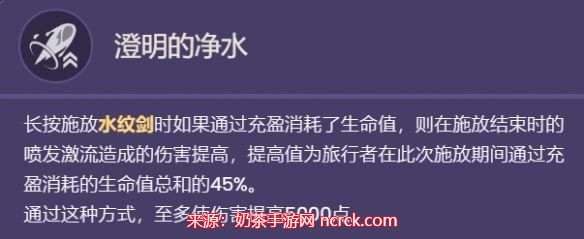 另外,水主还拥有固有天赋-澄明的净水。当在施放水纹剑时通过充盈消耗了生命值时,施放结束时的喷发激流所造成的伤害将提高,提高值等于旅行者在此次施放期间通过充盈消耗的生命值总和的45%。通过这种方式,水主最多能使伤害提高5000点。