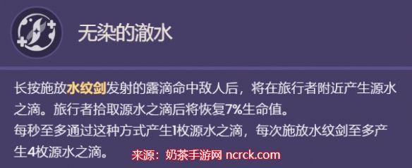 水主的固有天赋之一是无染的澈水。当水纹剑释放的露滴命中敌人后,将在旅行者附近产生源水之滴。旅行者拾取这些源水之滴后将恢复7%的生命值。每秒最多产生1枚源水之滴,并且每次施放水纹剑最多产生4枚源水之滴。