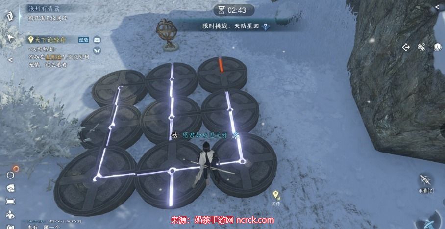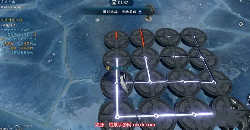 首先,解锁浑天仪迷阵。在这一步中有一个BUG,你必须一次性成功,否则会卡住并离开场景,需要重新等待暴风雪。因此,请在这之前先标记下大致的图案。