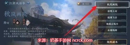 3、在副本列表中选择秋岚画院副本,点击挑战开始。