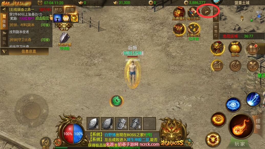 1、首先,进入龙腾天下游戏后,点击屏幕右上角的箭头图标,弹出菜单选项。