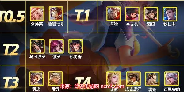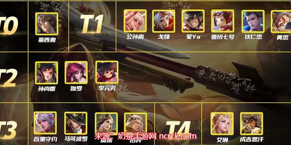 T1:莱西奥、公孙离、蒙犽、鲁班七号、狄仁杰、黄忠;