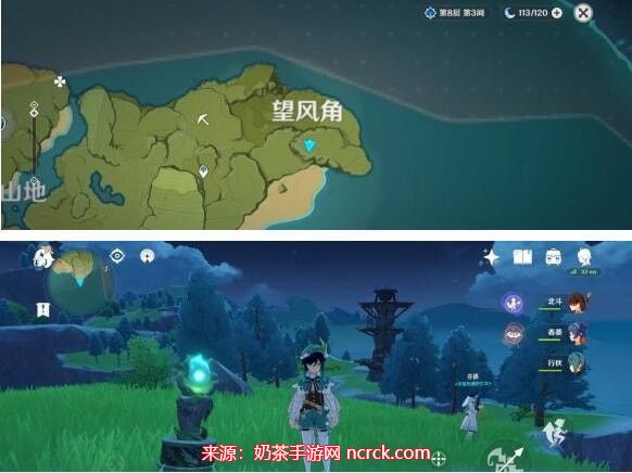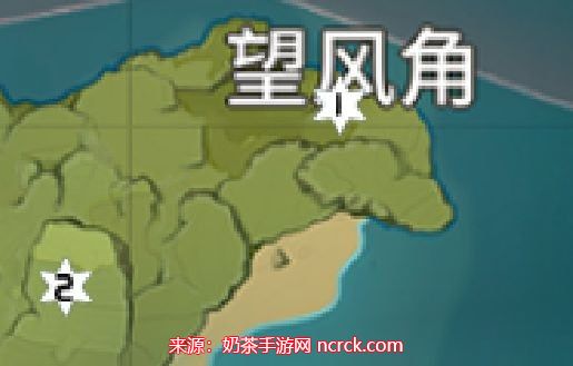 望风角仙灵的位置在一个名为“风”的字中,往前走的悬崖边。在离角色几个身位的位置,你将看到一个锚点下的山坡顶端高台上。如果你打开元素视角,你会发现有个岩元素反应被隐藏在下面。