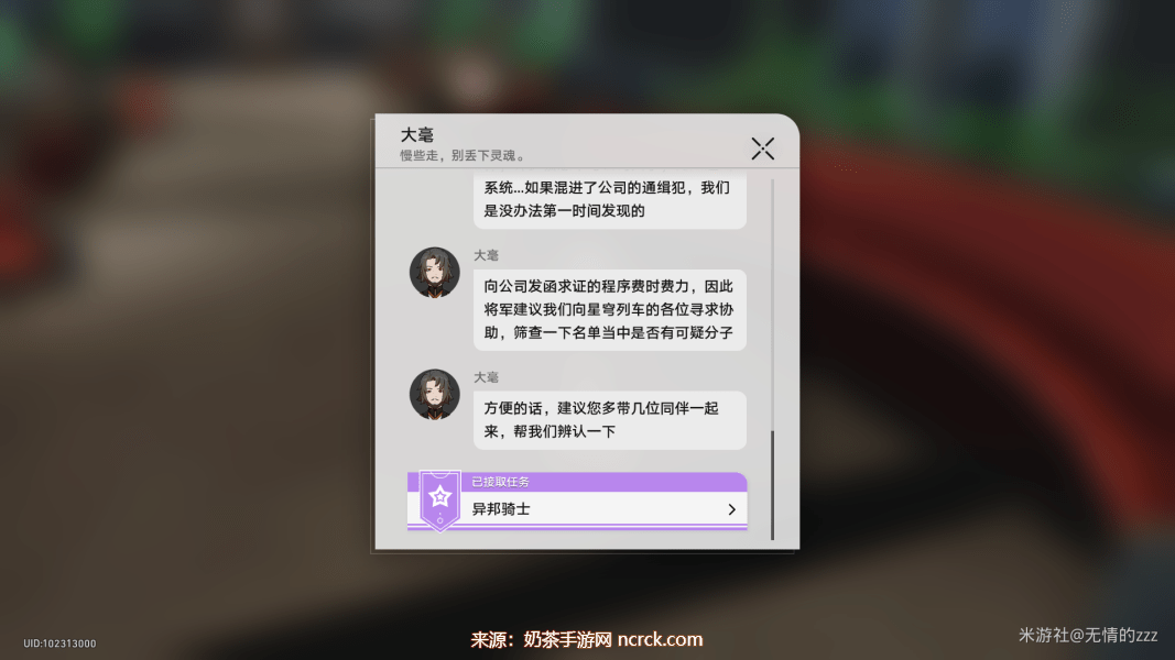 1.当我们在完成了罗刹的同行任务以后,我们会在短信框收到一份来自净砚的短信,短信中要求我们再次回到地衡司观看录像