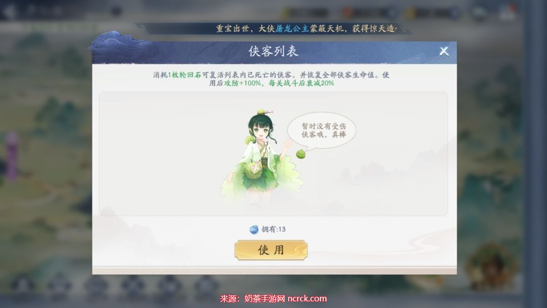 如果战斗失败,我们可以在侠客界面复活已阵亡的侠客。需要注意的是,复活后所有侠客的攻击和防御属性将提升100%。复活也可以恢复侠客的血量,并获得额外加成。