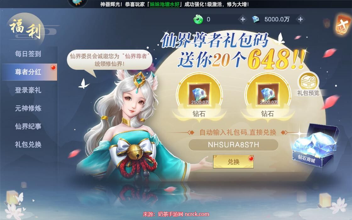2、在兑换码页面,您将首先看到一个尊者分红的礼包码。这个礼包码已经自动输入,您只需点击兑换按钮,即可获得对应的奖励。