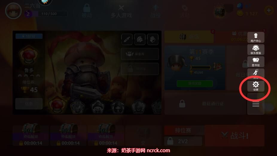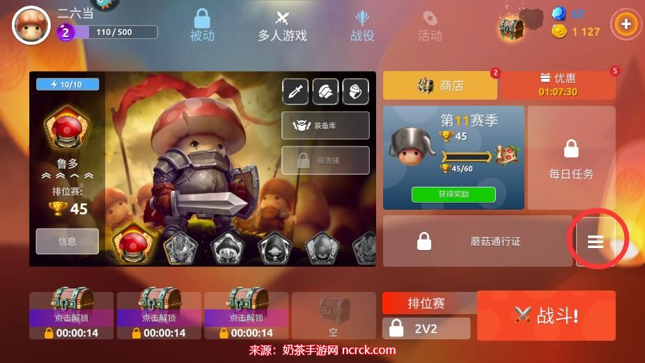 在蘑菇战争2的主界面中,您可以找到位于右侧的三条杠图标。请点击该图标,以展开更多选项。