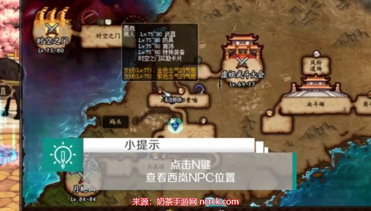 4、在与"素喃"对话后,按下"N键"打开地图。你将能够看到地图上标有西岚所在位置的标记。